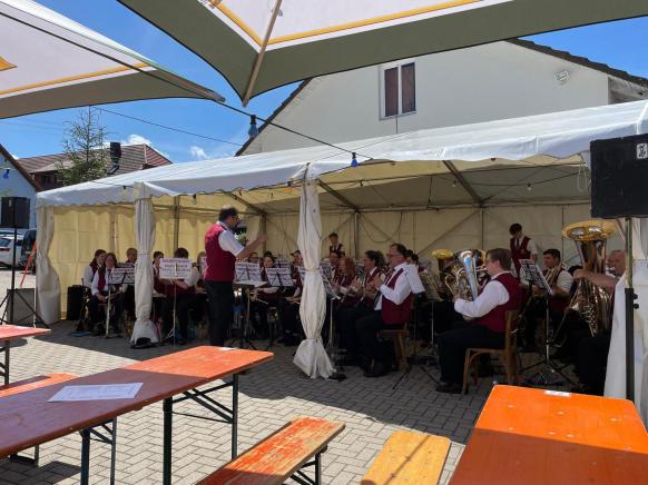 Am letzten Sonntag (14.07.2024) haben wir uns gemeinsam mit ein paar Fans auf den Weg nach Rotzel gemacht, um dort beim Musikfest den Frühschoppen zu eröffnen. Dank des tollen Wetters war das Fest bereits bei unserer Ankunft gut besucht. Ab 11:30 Uhr konnte das Publikum uns zu hören und wurde mit gewohnter Lässigkeit von Florian Siebold durch unser Programm geführt. Nach guten anderthalb Stunden Unterhaltungsmusik wurden wir dann durch den Musikverein Hochsal abgelöst und wir konnten die Sonne ebenfalls noch mit Blasmusik genießen.
