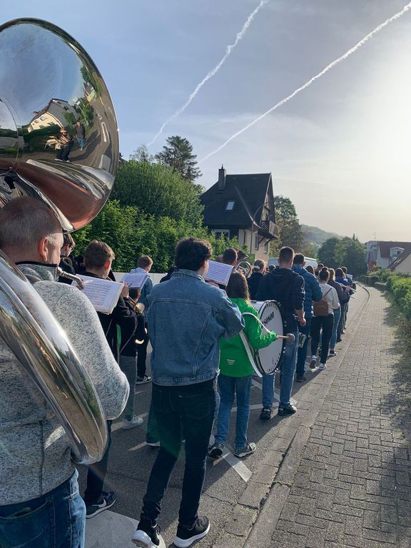 Das Stück „Der Mai ist gekommen“ war einige Male beim Maiwecken am Morgen des ersten Mai zu hören. Leider konnten wir wegen des Regens (wie hätte es auch anders sein sollen) zunächst nicht marschieren, sondern nur an den einzelnen Stationen entlang der Riehenstraße und in der Dorfstraße spielen. Erst am späten Vormittag hatte der Himmel ein Einsehen und so konnten wir zumindest den Weg zur letzten Station mit Marschmusik zurücklegen. Vielen Dank an alle Zuhörer und an diejenigen, die uns ein trockenes Plätzchen sowie reichlich Essen und Trinken anboten. Wir kommen nächstes Jahr gerne wieder vorbei!